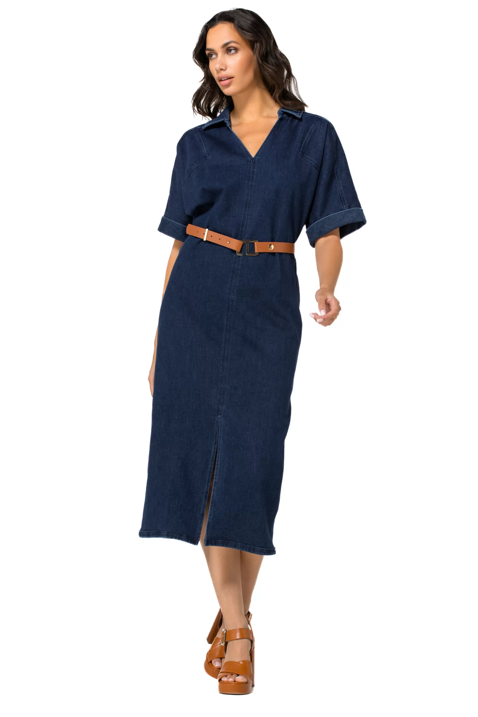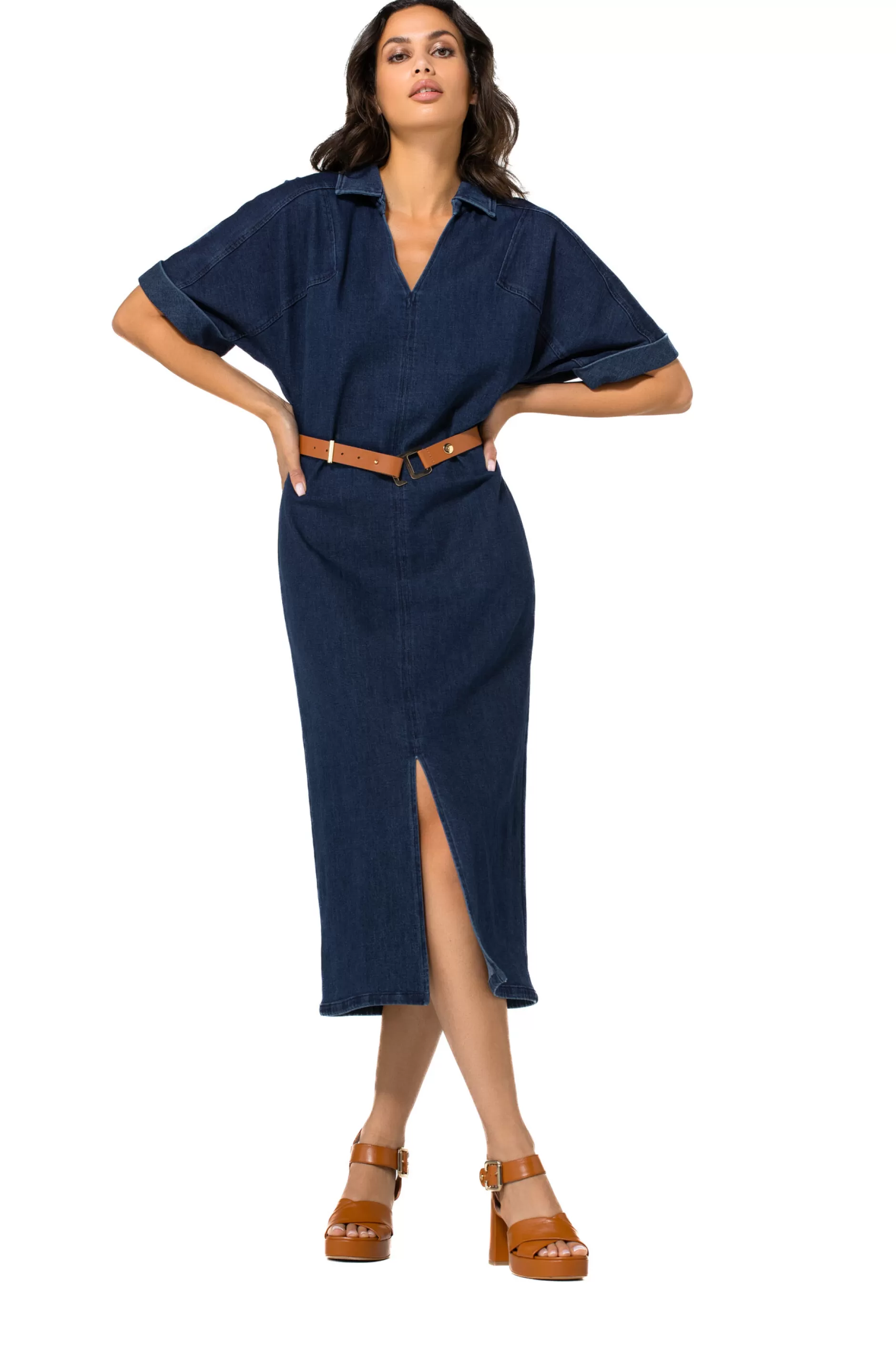 Rechtvallende Midi Jurk In Jeans Met Stretch &Nbsp;Ongevoerd Omwile Van Comfort Geen Zakken Korte Wijde Mouw Met Omslag …