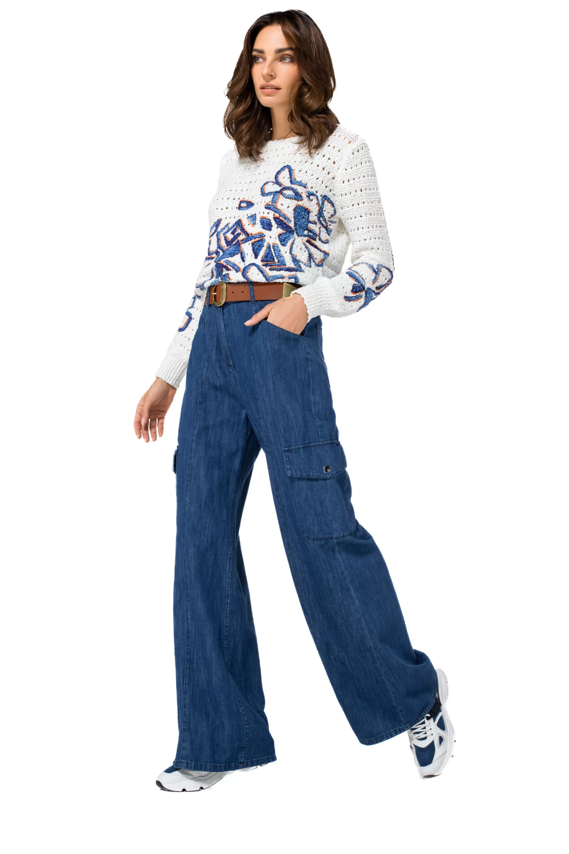 Los Gebreide Pull Met Print &Nbsp;Lange Mouw Met Bol Effect Aan Mouwboord Brede Ronde Hals