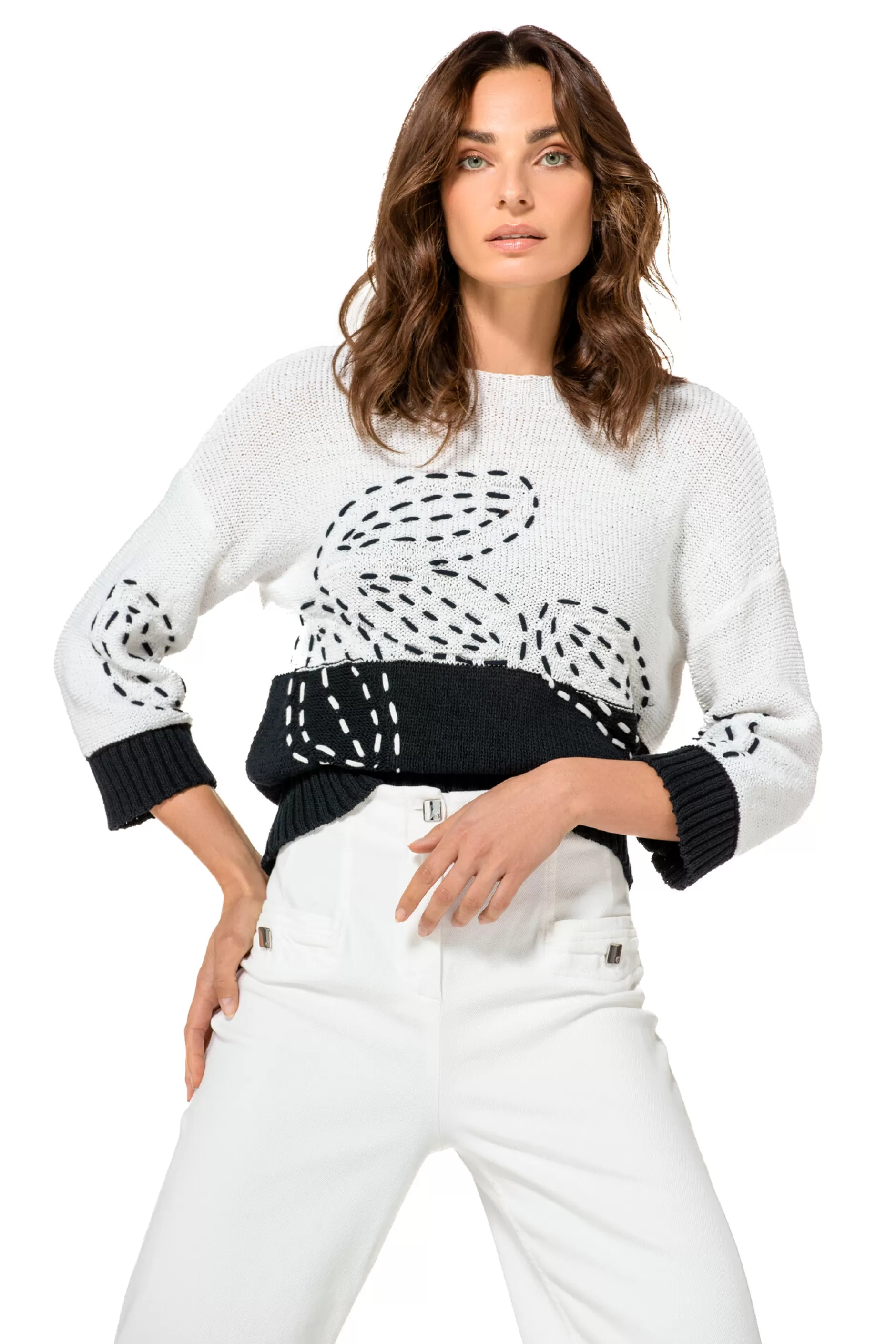 Katoenen Pull Bicolor &Nbsp;3/4 Mouw Met Mouwboord Hoge Zoomboord Brede Ronde Hals