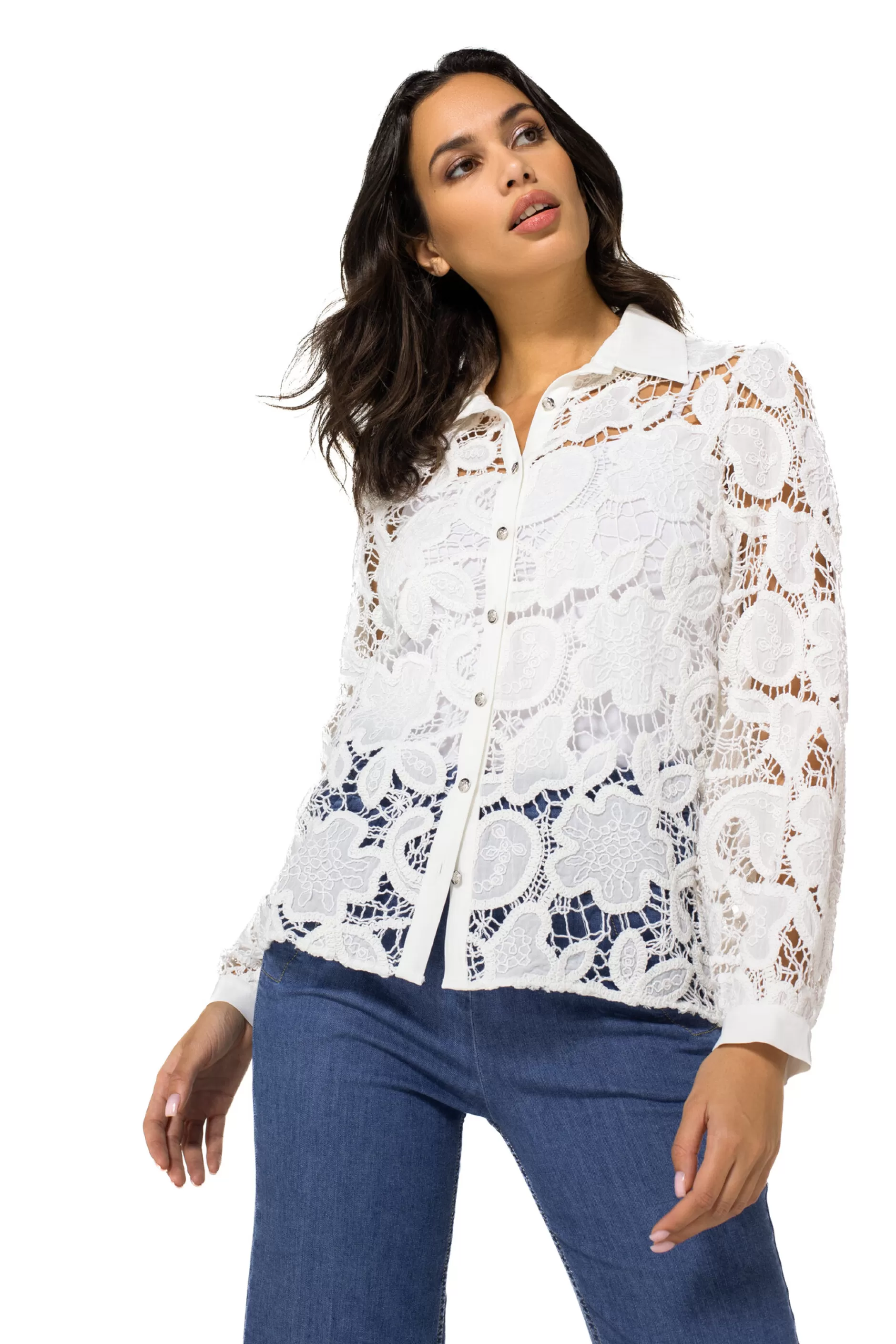 Halfdoorzichtige Katoenen Bloes Met Broderie &Nbsp;Knoopsluiting Middenvoor Lange Wijde Mouw Met Mouwboord