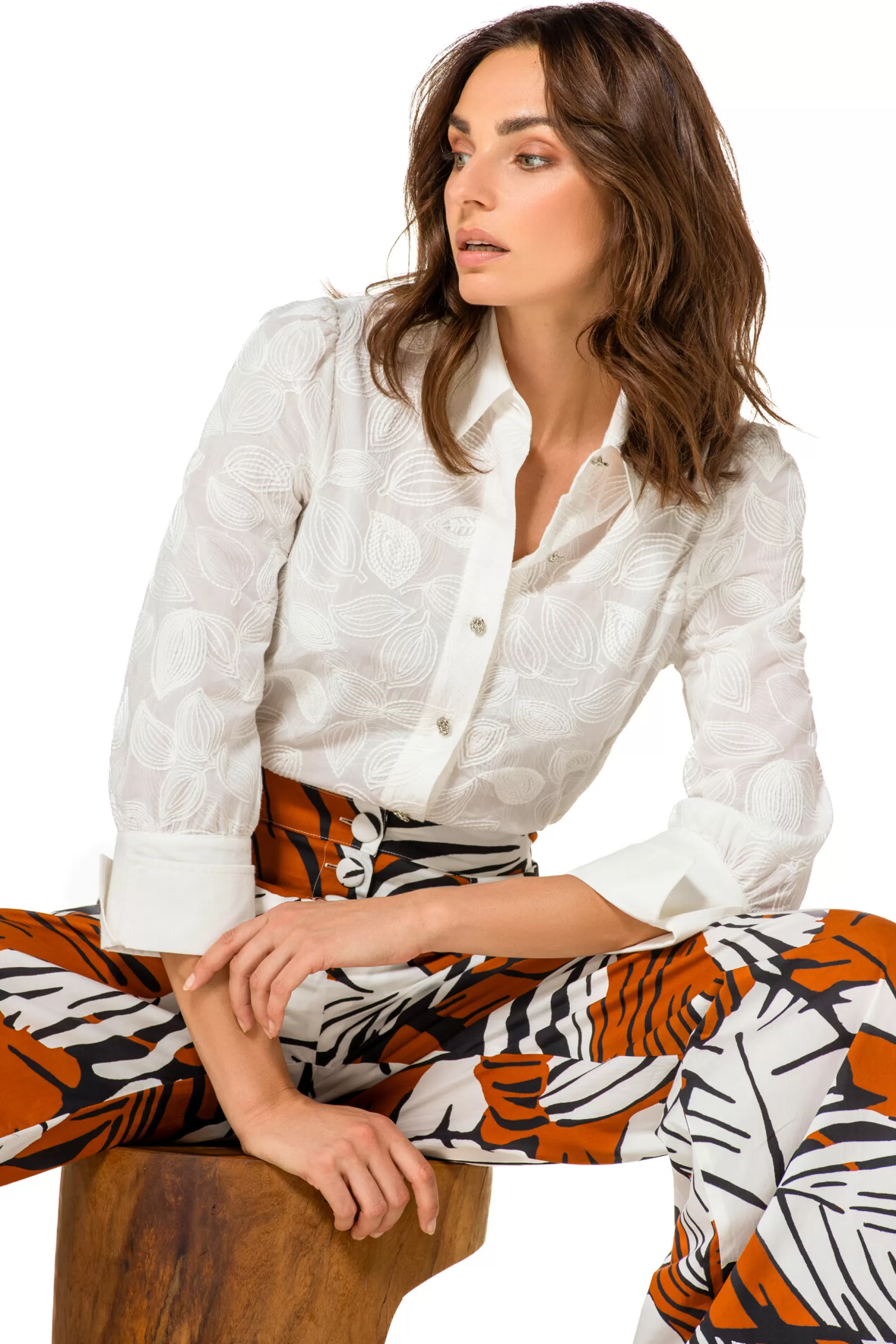 Rechtvallende Katoenen Bloes Met Broderie &Nbsp;3/4 Mouw Met Omslagboord Knoopsluiting Middenvoor Afgeronde Zoomboord